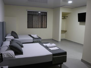 Habitación (primer piso) con acomodación múltiple. Cuenta con tres camas doble (1,90m*1,40m), baño privado, televisor, aire acondicionado, servicio de parqueadero.