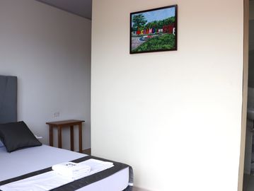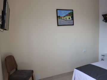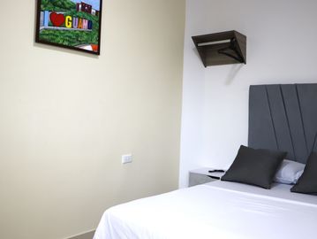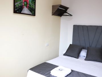 Habitación (primer piso) para pareja o persona individual. Cuenta con una cama doble (1,90m*1,40m), dos closet, baño privado, televisor, aire acondicionado, servicio de parqueadero.